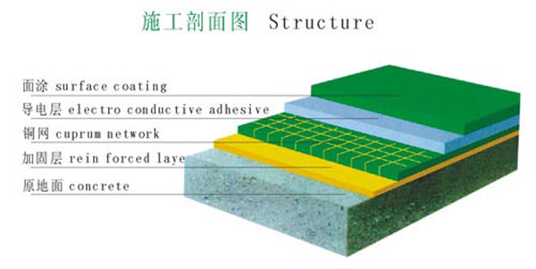 ⑦防靜電面漆:防靜電面漆滾涂二道,其體積/表面電阻平均系數值10^5Ω-10^9Ω,工后整體地面光亮潔凈,顏色均一,無空鼓;